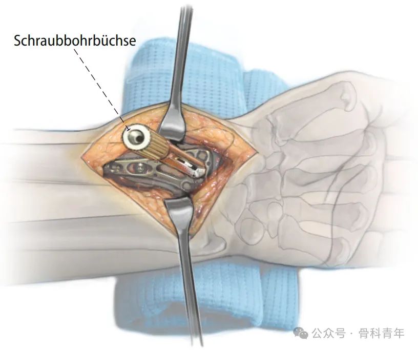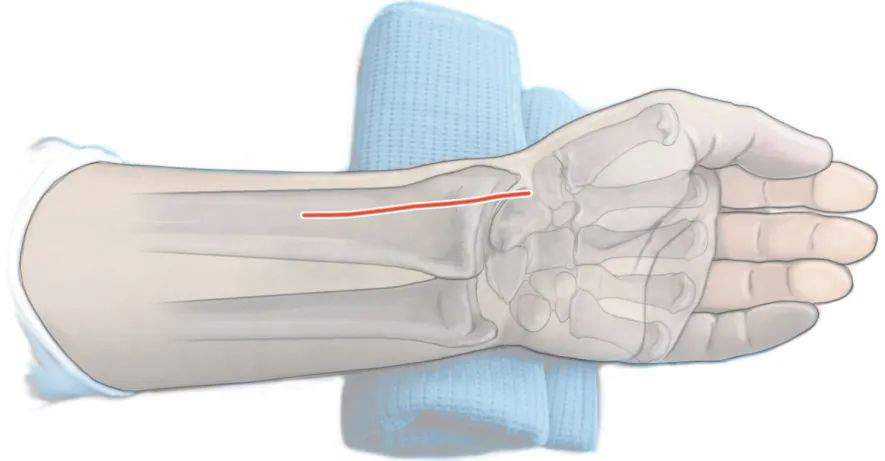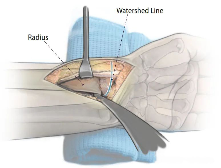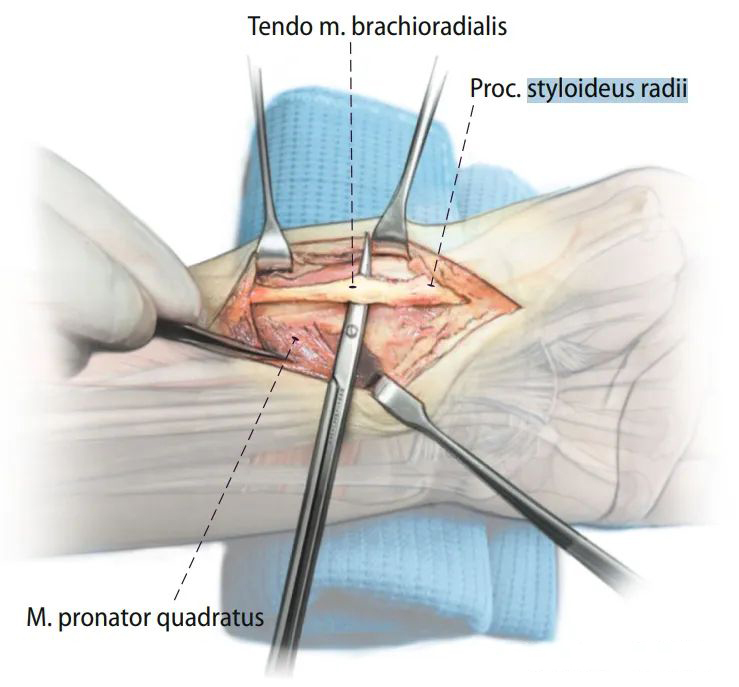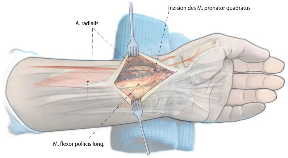 Общий доступ к дистальному концу лучевой кости с прямым расширением дистального конца (Источник изображения: DOI: 10.1007/s00064-015-0433-5)