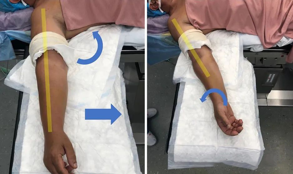 Пораженная конечность отведена, а поле зрения может быть изменено за счет пронации и супинации (Источник: DOI: 10.1007/s00064-023-00818-6).
