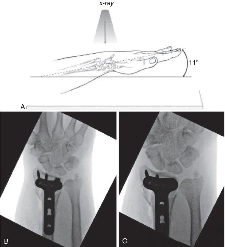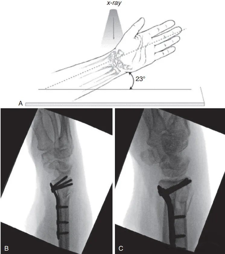 В настоящее время для оценки репозиции и положения винта используется внутренняя фиксация ладонной анатомической фиксирующей пластиной.Запястье приподнимается, чтобы компенсировать ладонный наклон и локтевую девиацию и избежать перекрытия суставных поверхностей: