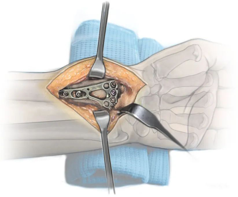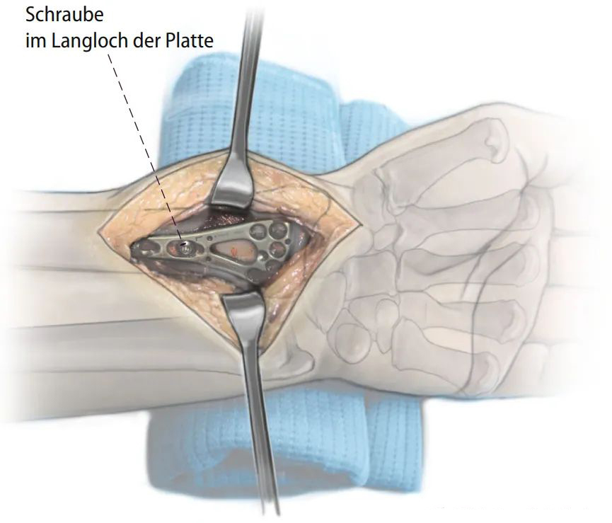 Дистальный конец лучевой кости вводят путем вытяжения, поддевания и т. д., через шиловидный отросток лучевой кости и ладонную сторону вводят спицу Киршнера, после временной фиксации вводят анатомическую пластинку соответствующей длины. При установке пластины следует обратить внимание на водораздел (см.: «линия водораздела» дистальной лучевой кости).